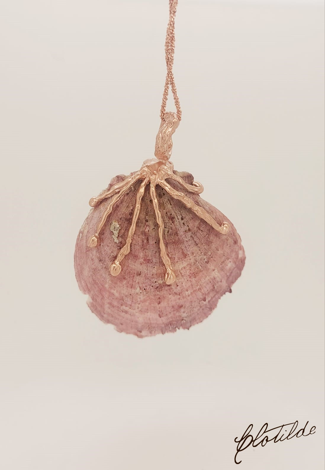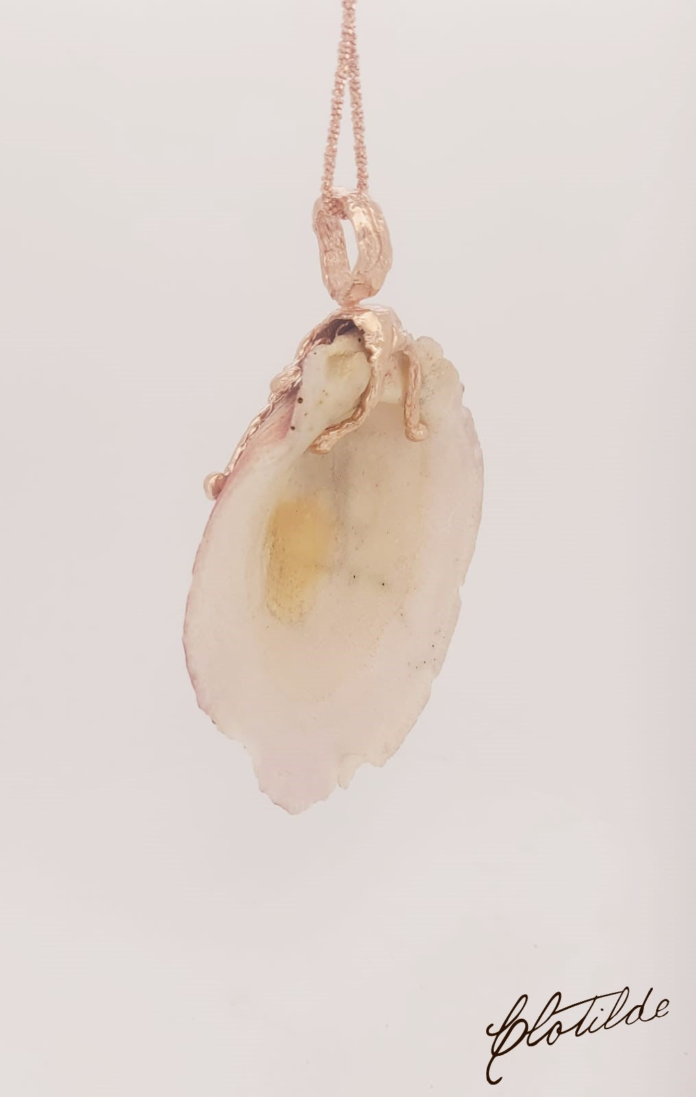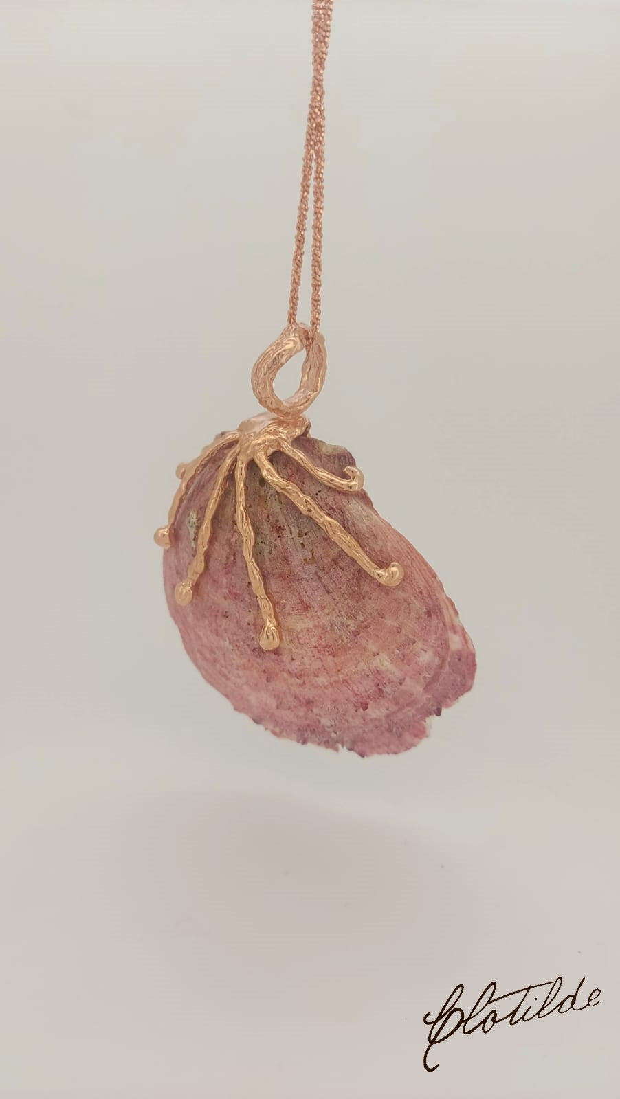 Ciondolo realizzato a mano su conchiglia fornita dal cliente, in argento 925, placcato oro.